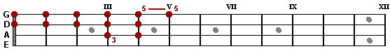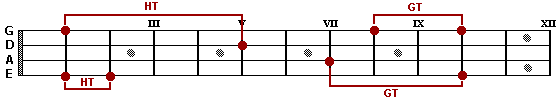 Im folgender Grafik ist je ein Beispiel für einen Halb- und Ganzton auf einer Saite und je ein Beispiel für einen Halb- und Ganzton auf benachbarten Saiten dargestellt.